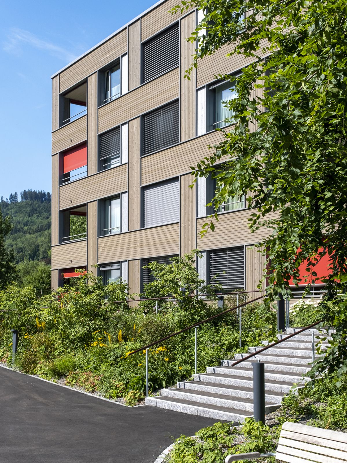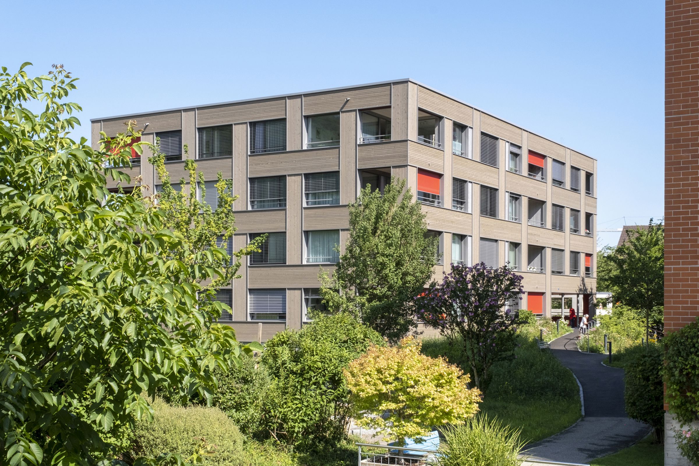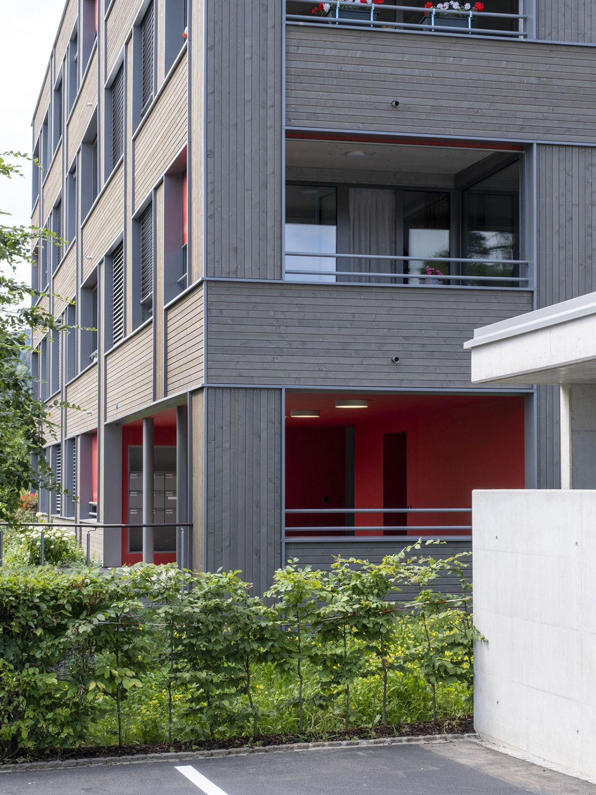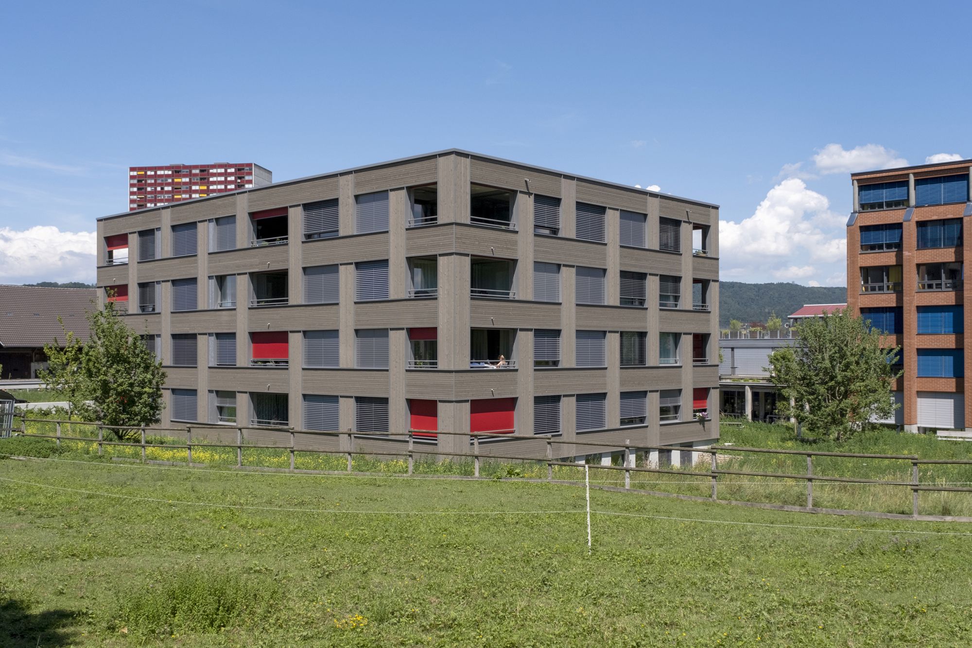 Der kompakte, viergeschossige Neubau mit dreiundzwanzig 2½- und 3½-Zimmer-Mietwohnungen steht zwischen bestehendem Altersheim und dem zum Teil unbebauten Rand des Dorfkernes. Im zwiebelringartig organisierten Gebäude sind jeweils sechs Wohnungen um die von oben belichtete Treppenhalle organisiert.