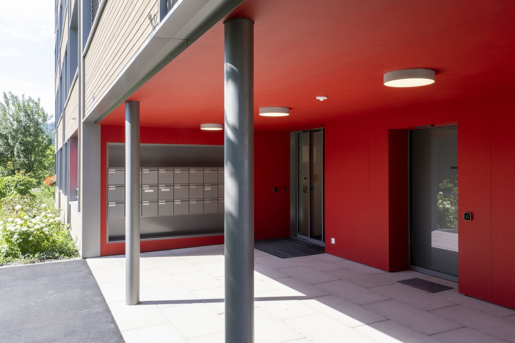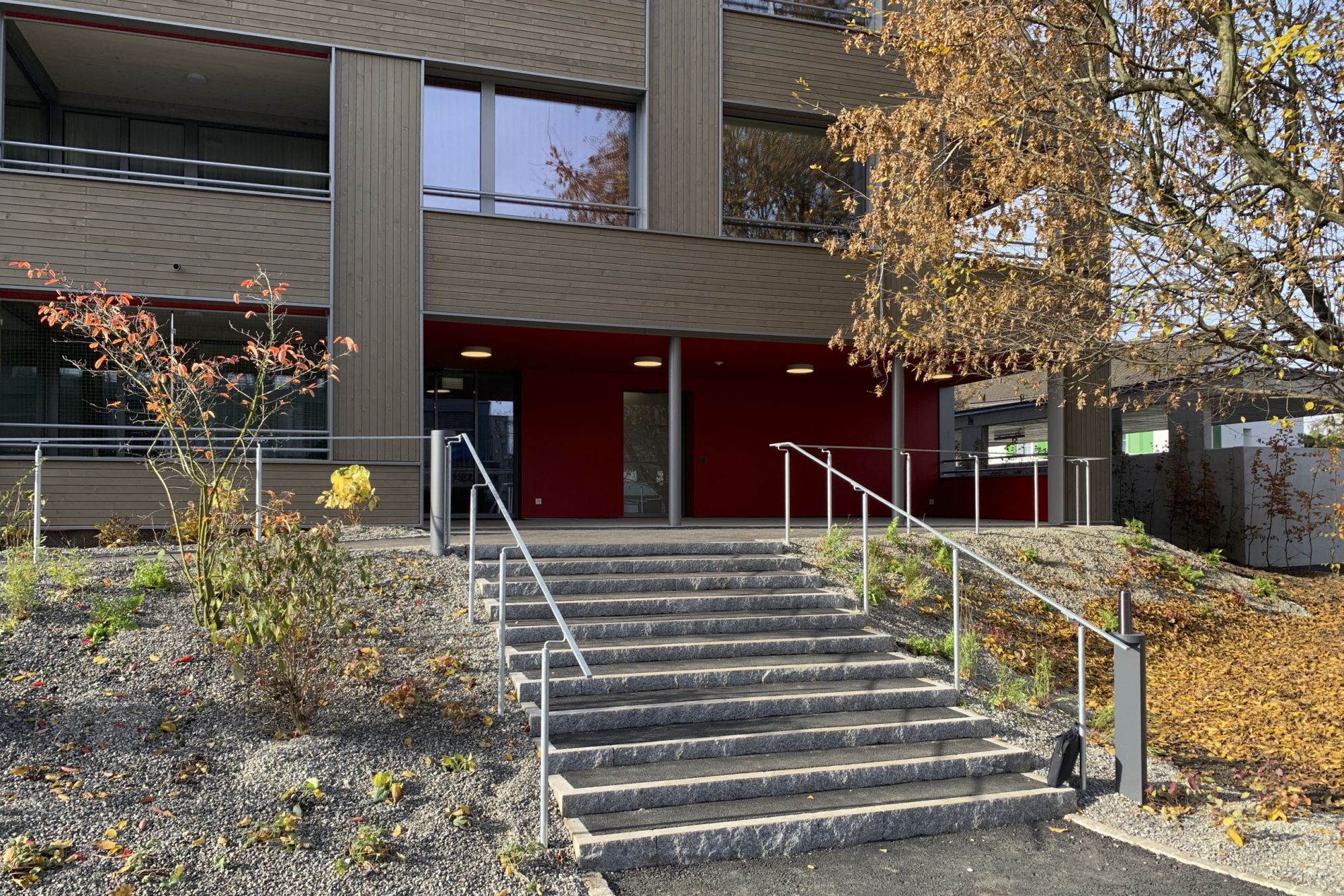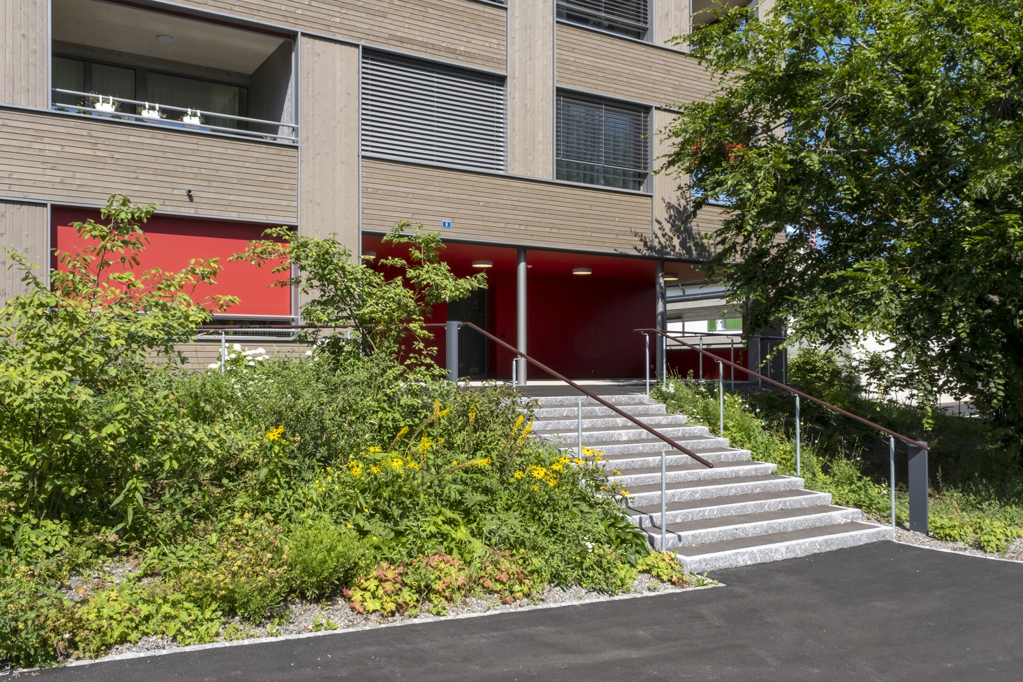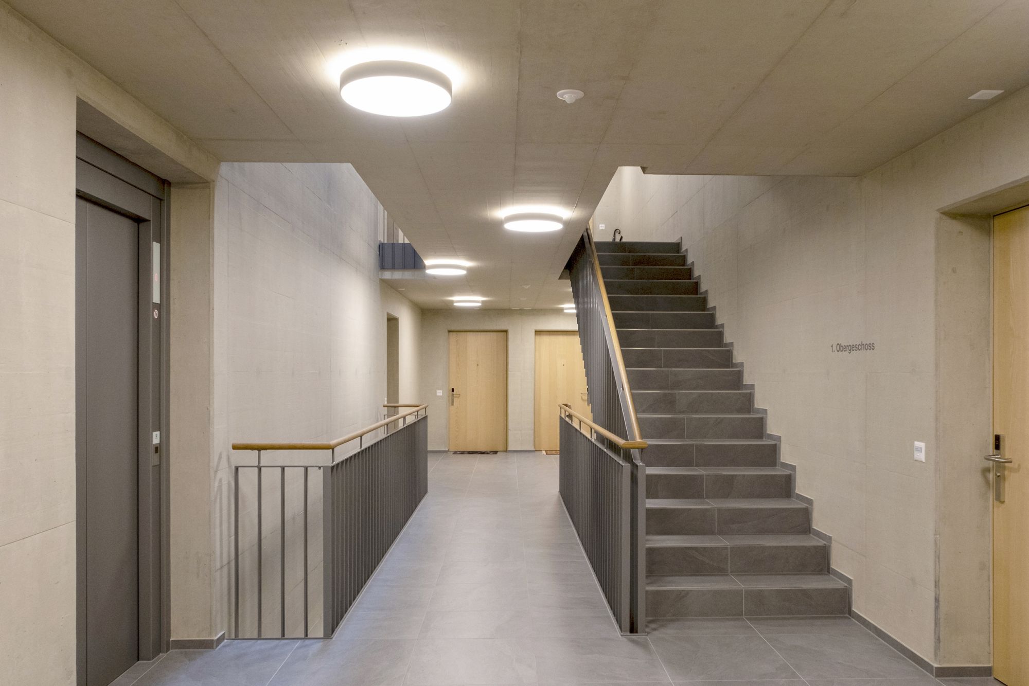 Der kompakte, viergeschossige Neubau mit dreiundzwanzig 2½- und 3½-Zimmer-Mietwohnungen steht zwischen bestehendem Altersheim und dem zum Teil unbebauten Rand des Dorfkernes. Im zwiebelringartig organisierten Gebäude sind jeweils sechs Wohnungen um die von oben belichtete Treppenhalle organisiert.