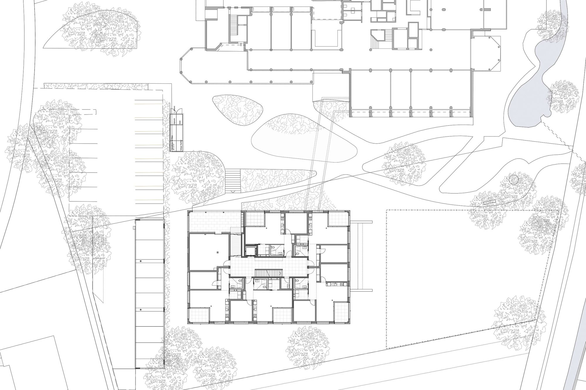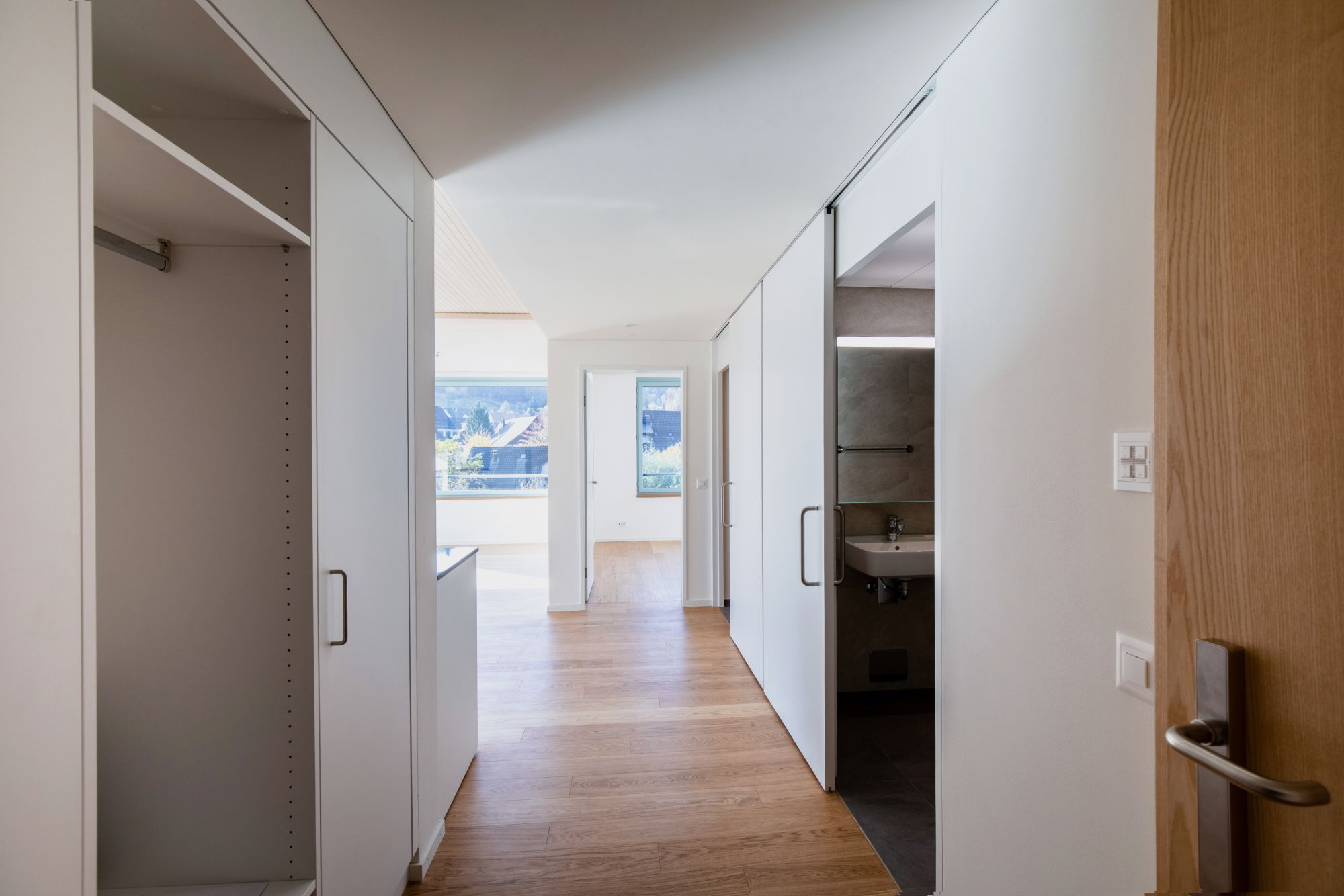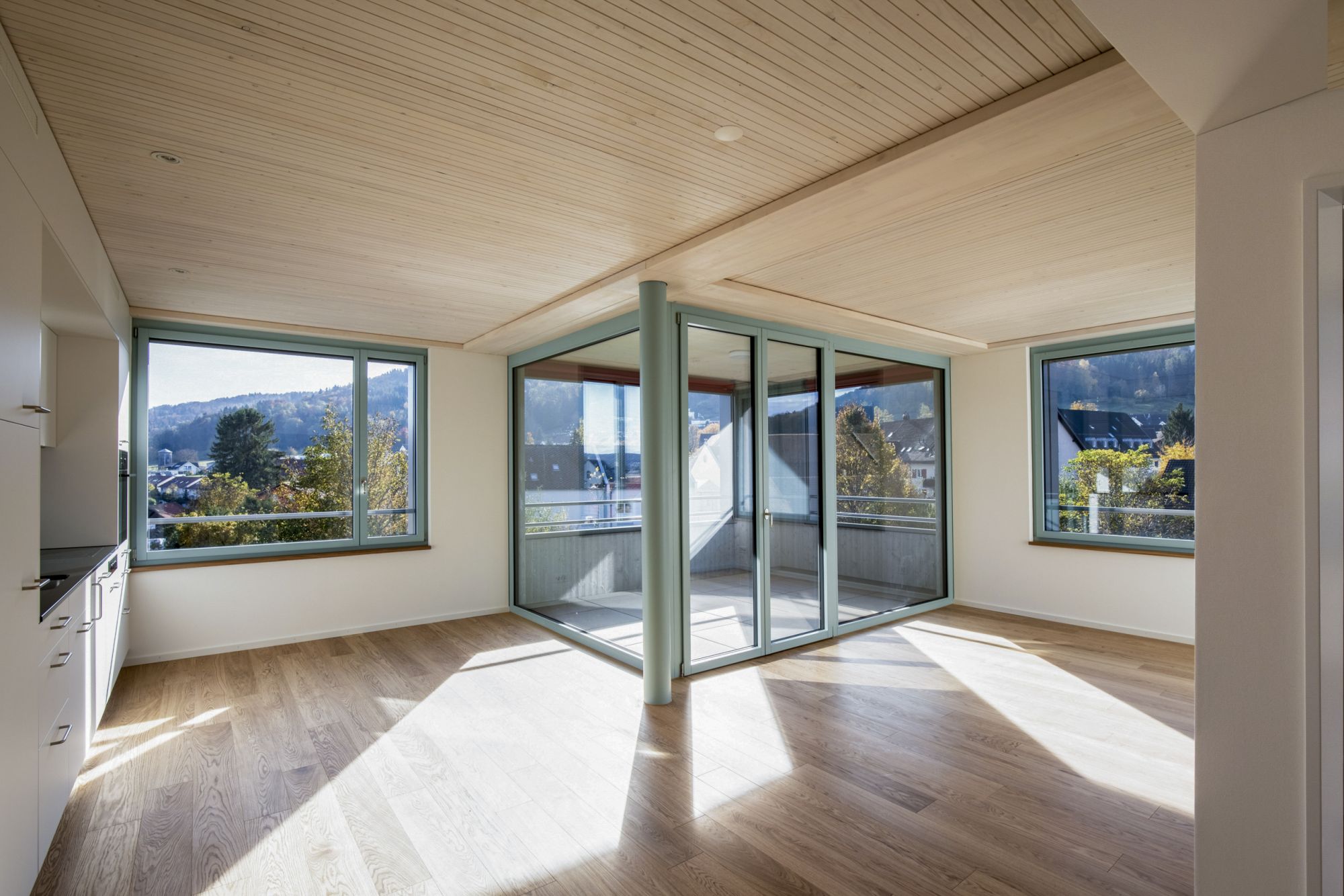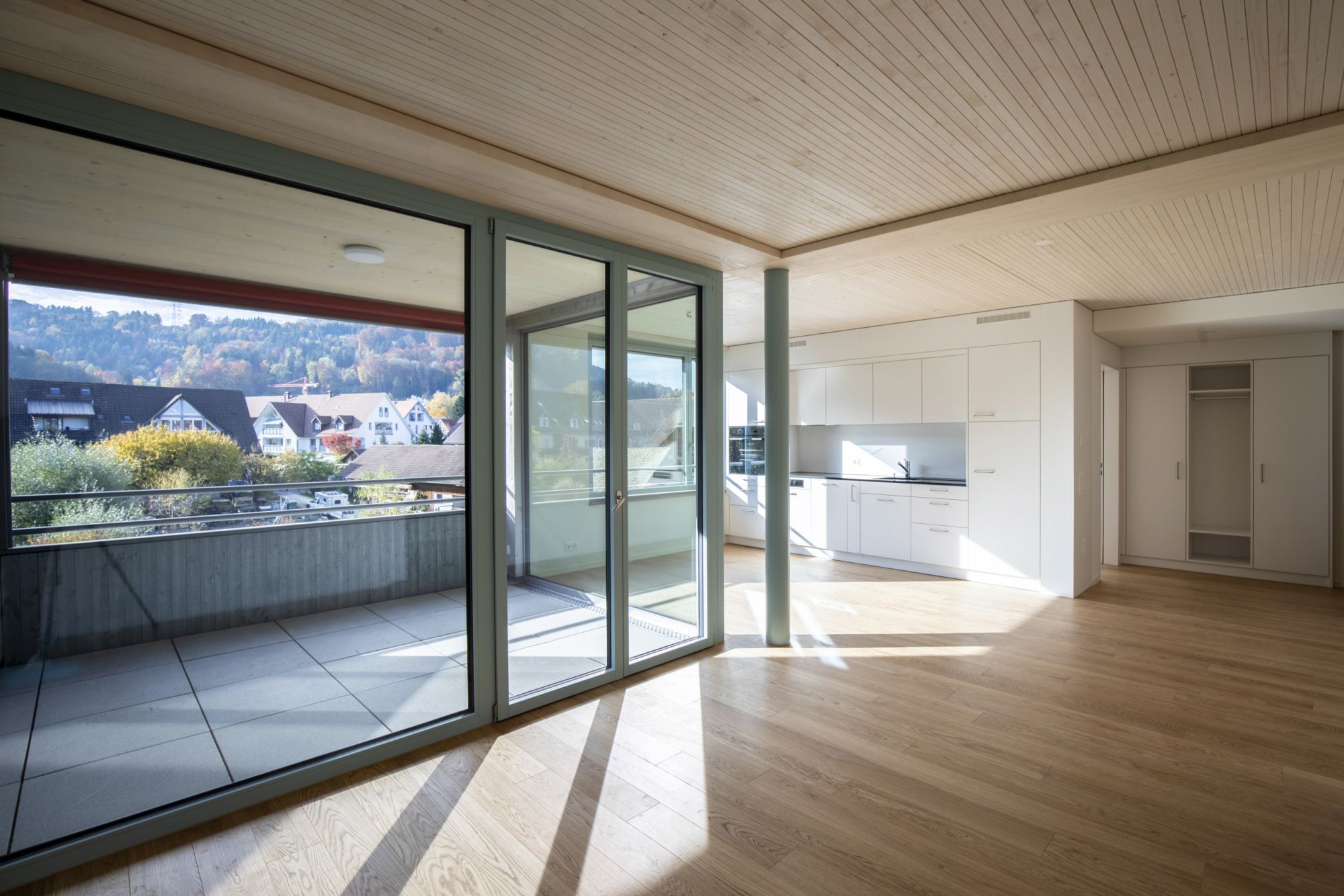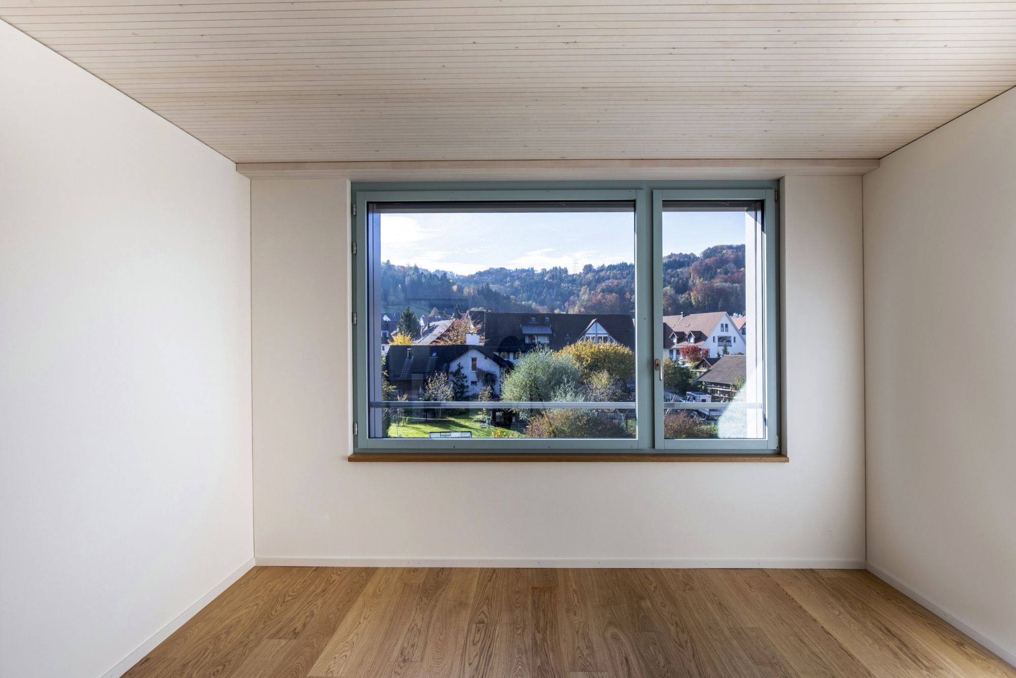 Der kompakte, viergeschossige Neubau mit dreiundzwanzig 2½- und 3½-Zimmer-Mietwohnungen steht zwischen bestehendem Altersheim und dem zum Teil unbebauten Rand des Dorfkernes. Im zwiebelringartig organisierten Gebäude sind jeweils sechs Wohnungen um die von oben belichtete Treppenhalle organisiert.