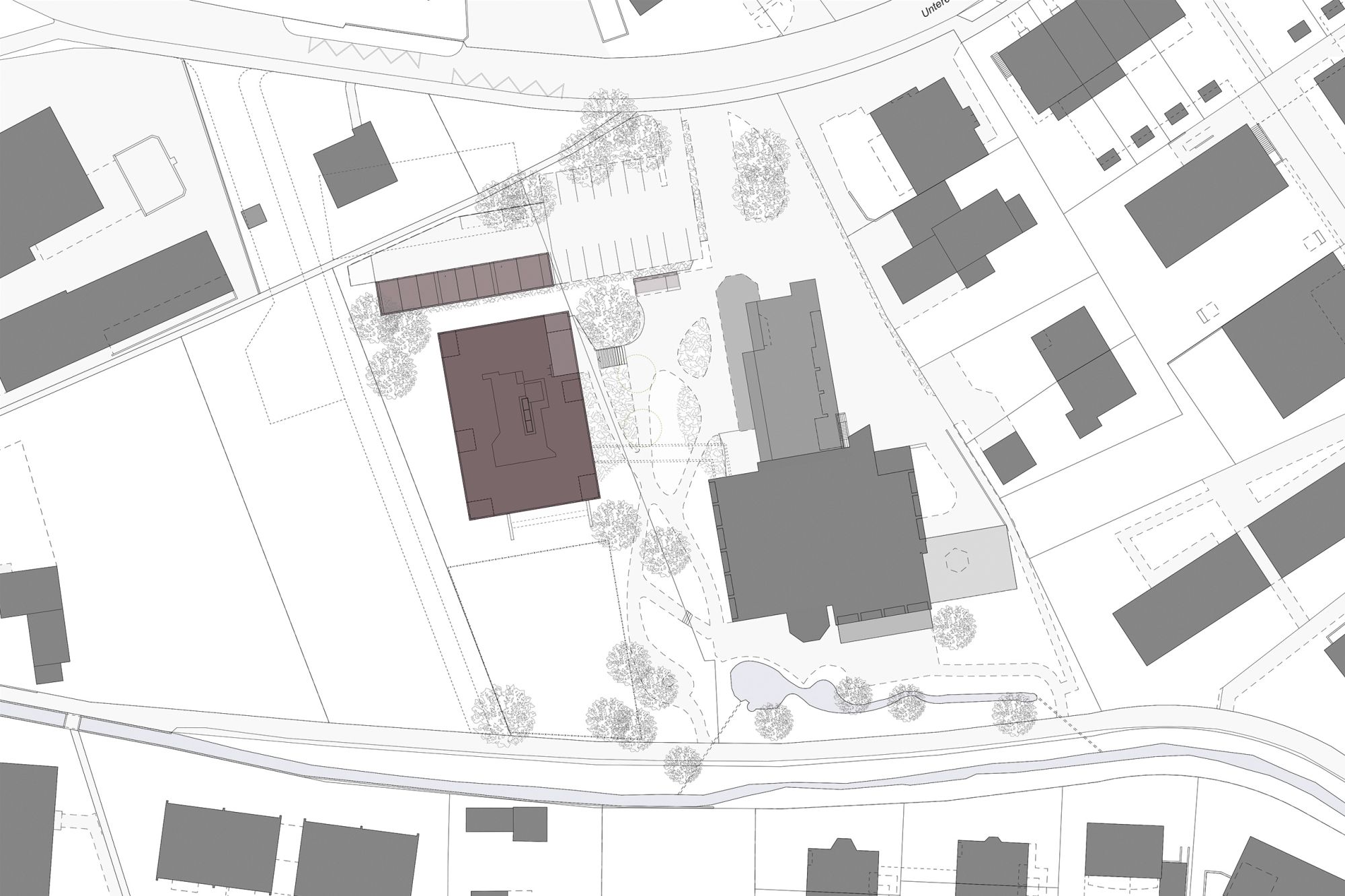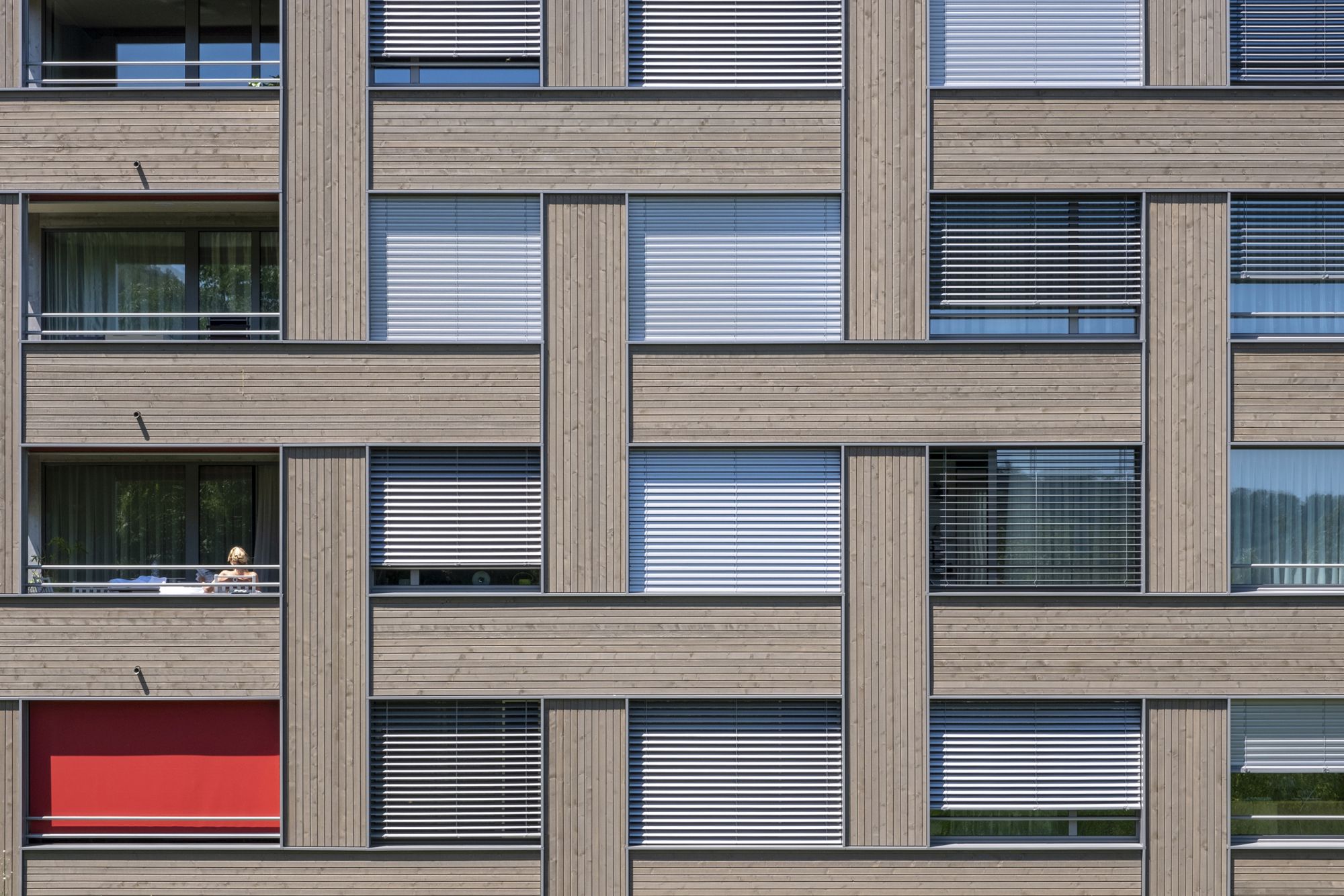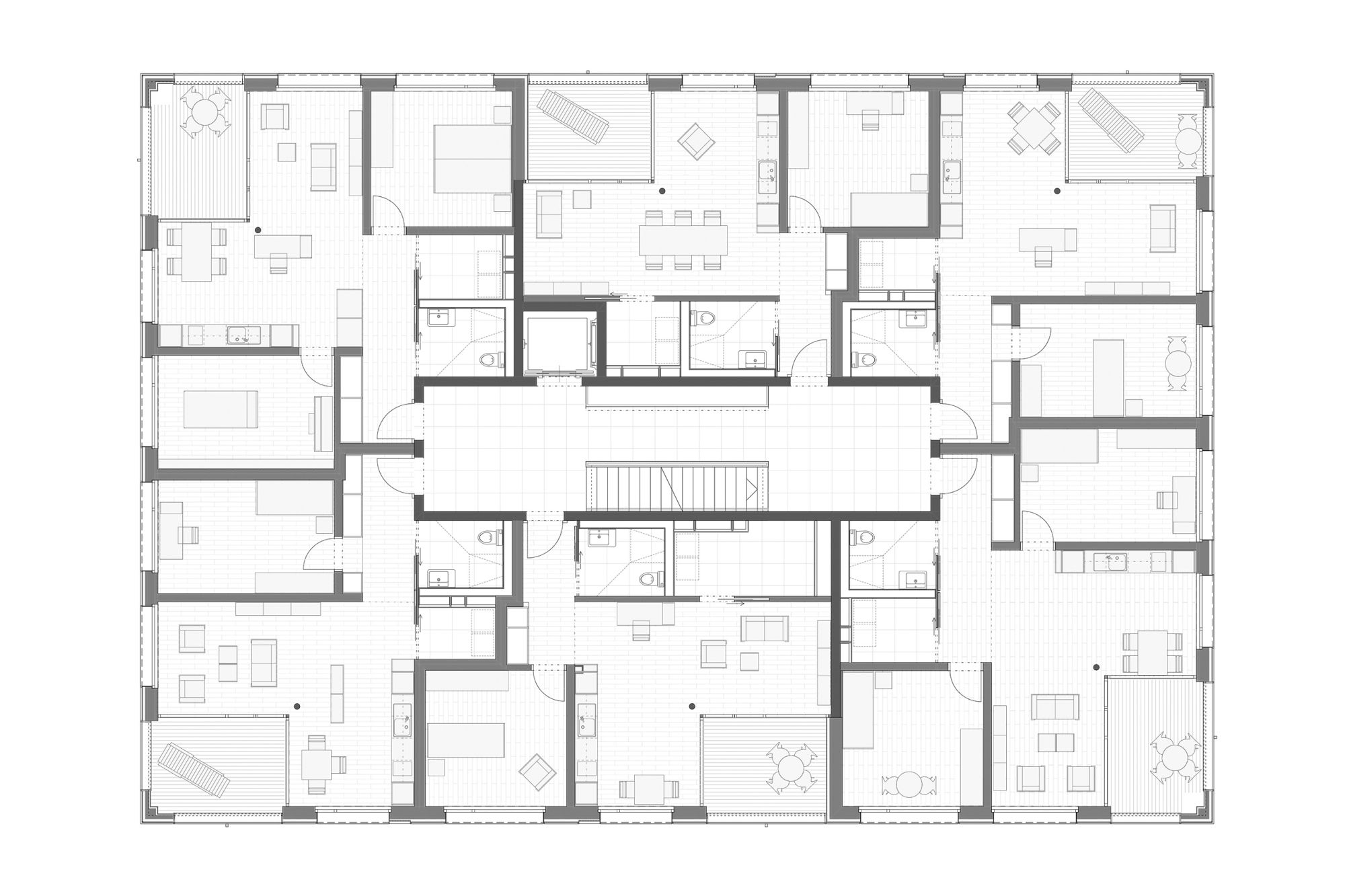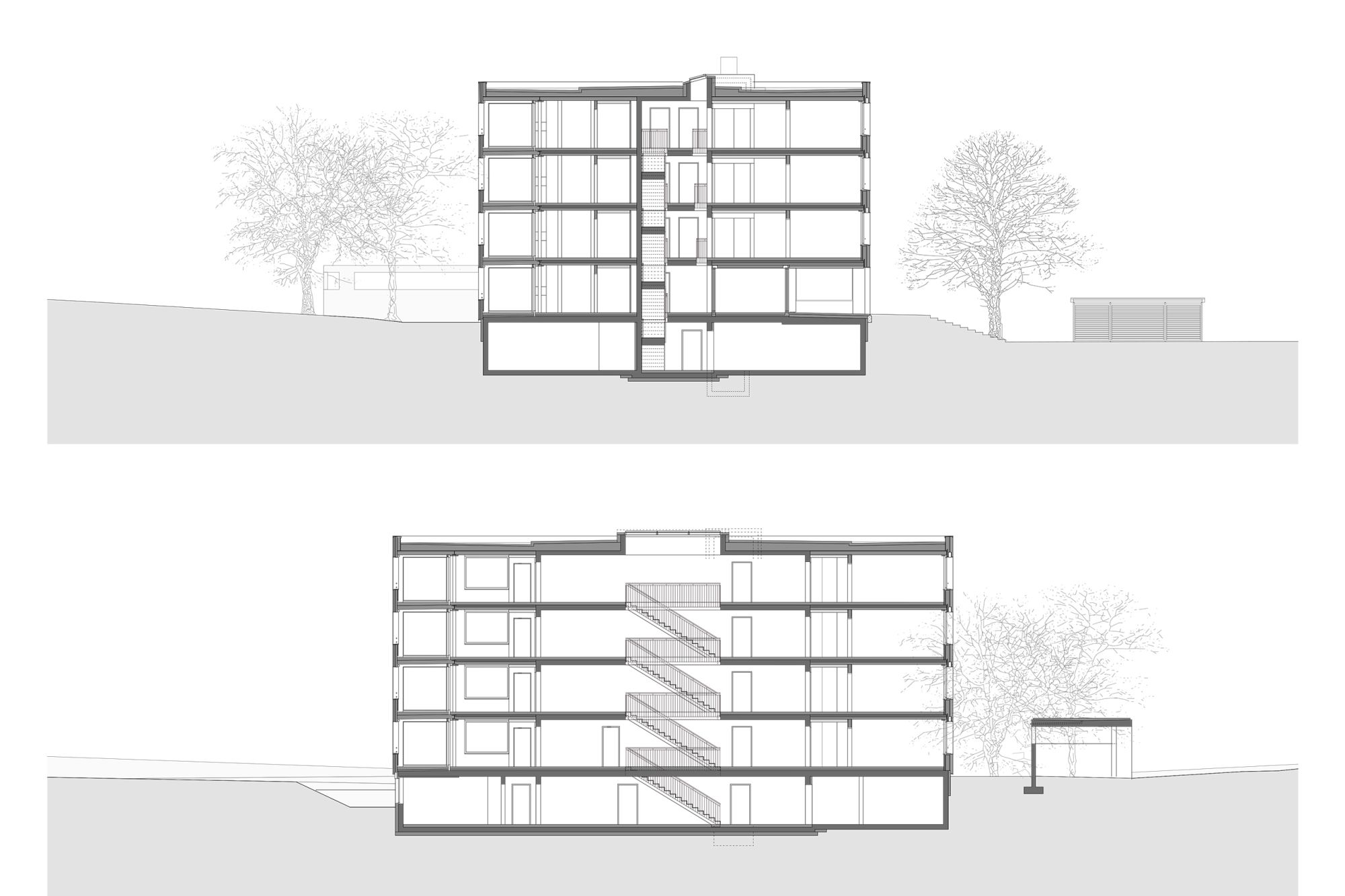 Der kompakte, viergeschossige Neubau mit dreiundzwanzig 2½- und 3½-Zimmer-Mietwohnungen steht zwischen bestehendem Altersheim und dem zum Teil unbebauten Rand des Dorfkernes. Im zwiebelringartig organisierten Gebäude sind jeweils sechs Wohnungen um die von oben belichtete Treppenhalle organisiert.