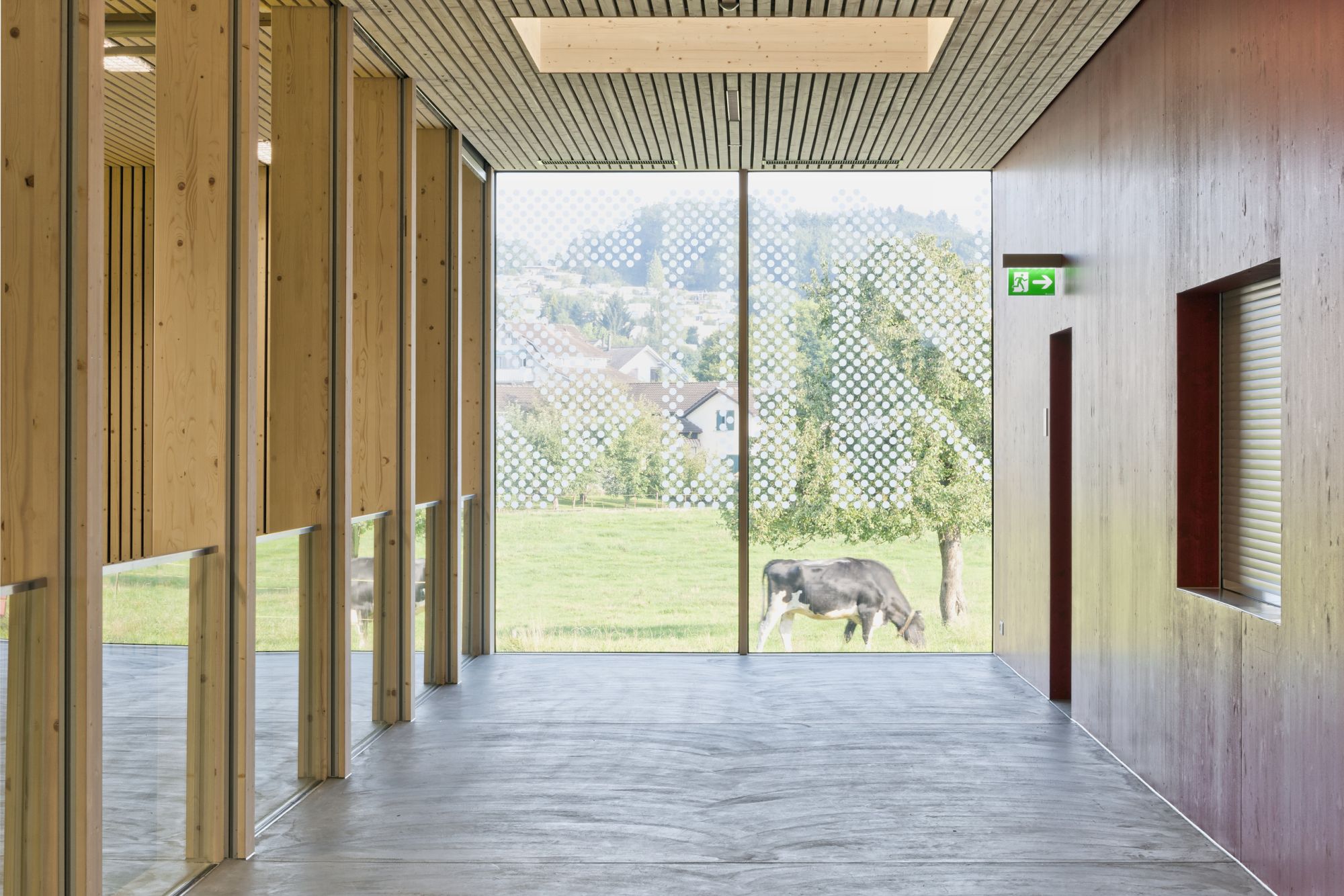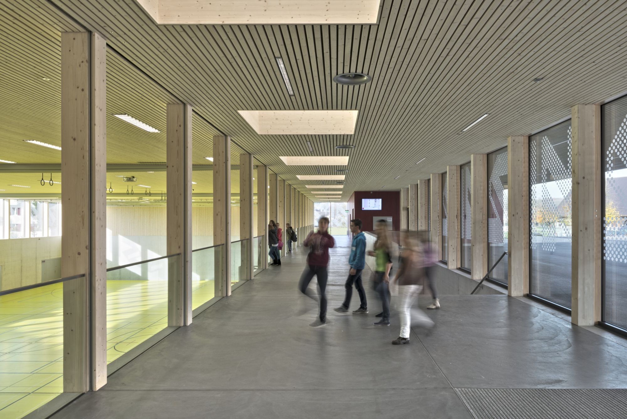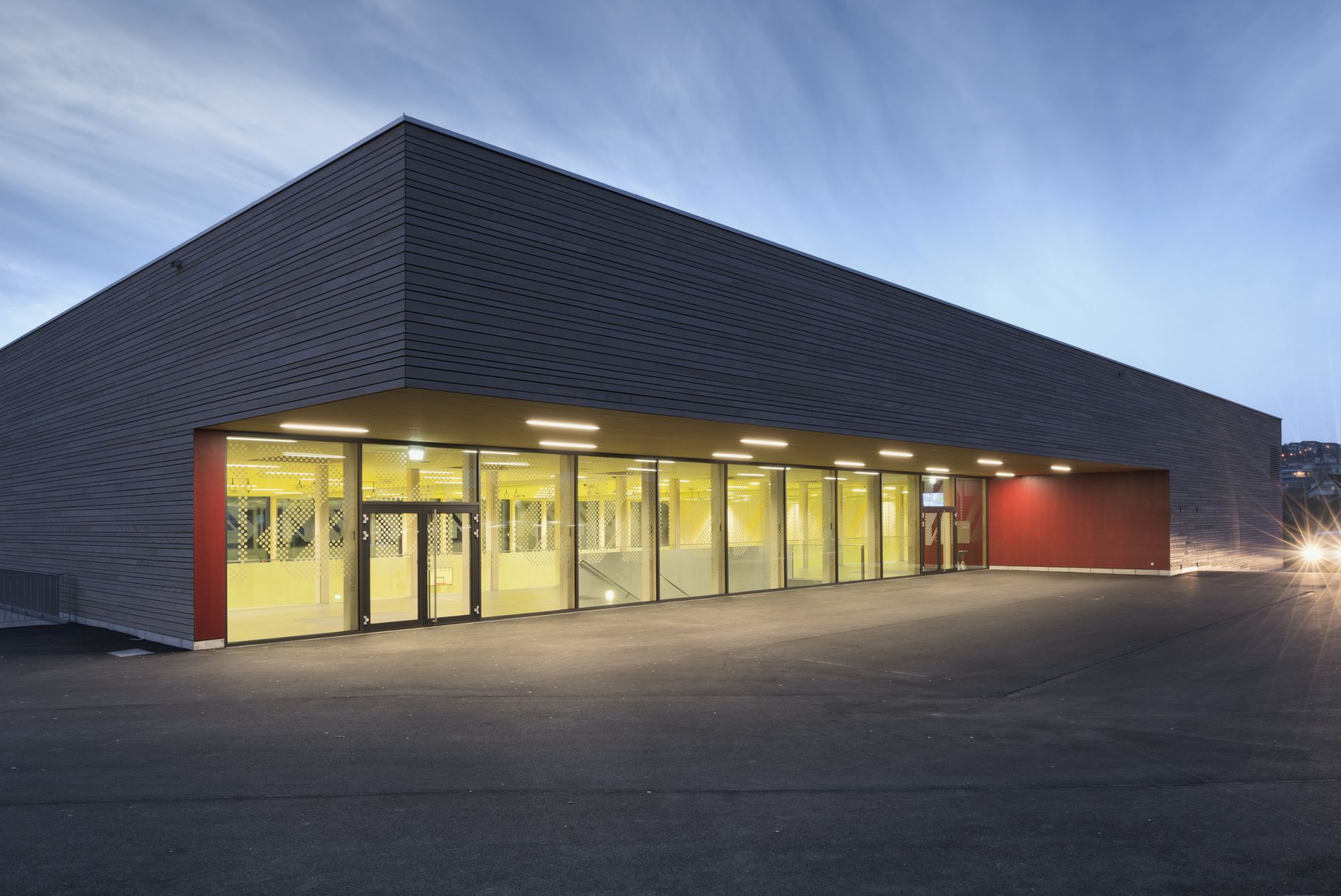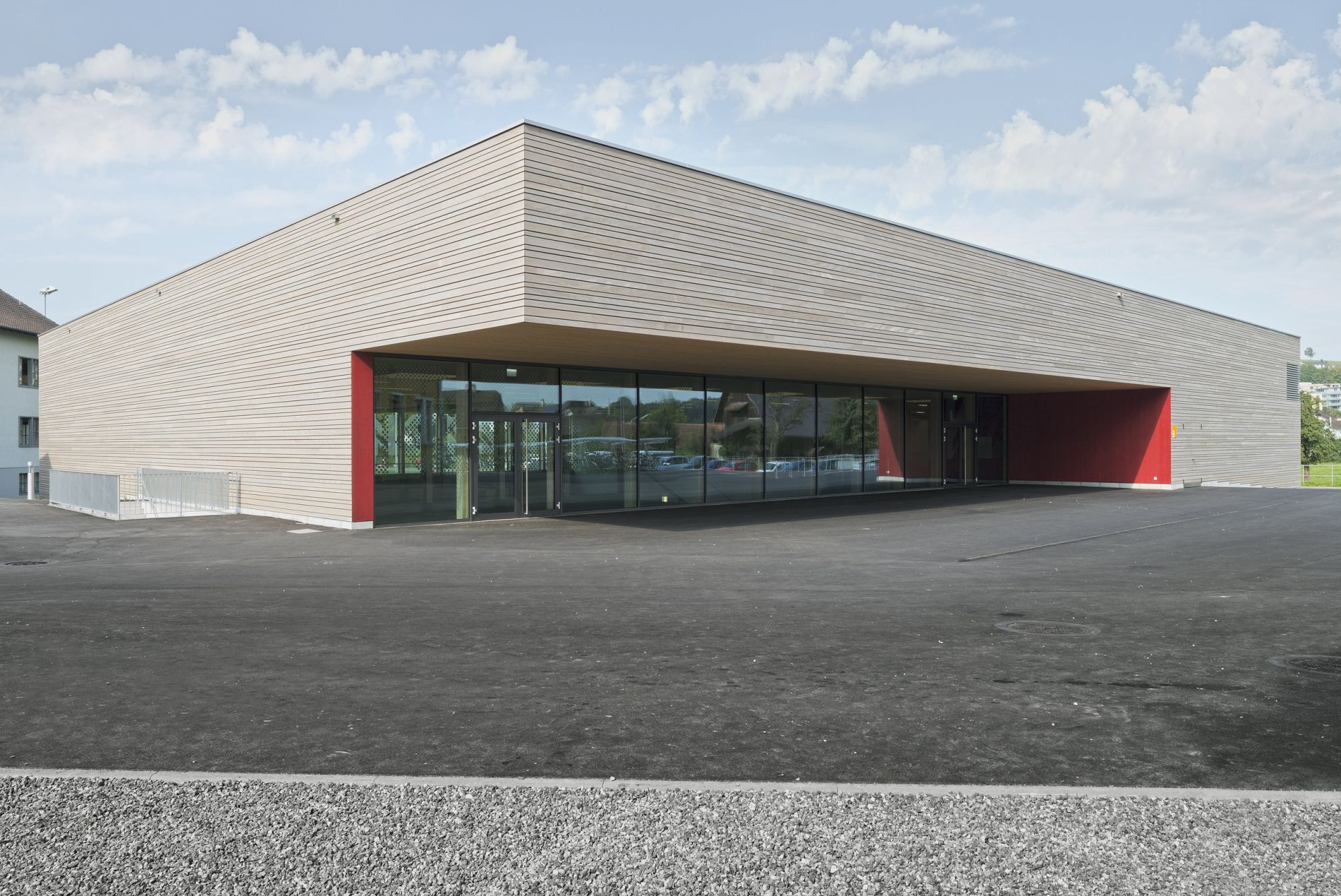 Die neue Mehrzweckhalle ist die erste Etappe der Neugestaltung des Schulareals Ammannsmatt zu einem Oberstufenzentrum. Dabei bilden die drei neuen, relativ niedrigen, einfachen Baukörper zusammen mit dem bestehenden dörflichen Kontext eine ausgewogene räumliche Aufteilung. Die Dreifachsporthalle ist mit einer mobilen Bühne ausgestattet, Gastrobereich, Foyer und ein Proberaum ergänzen das Programm.