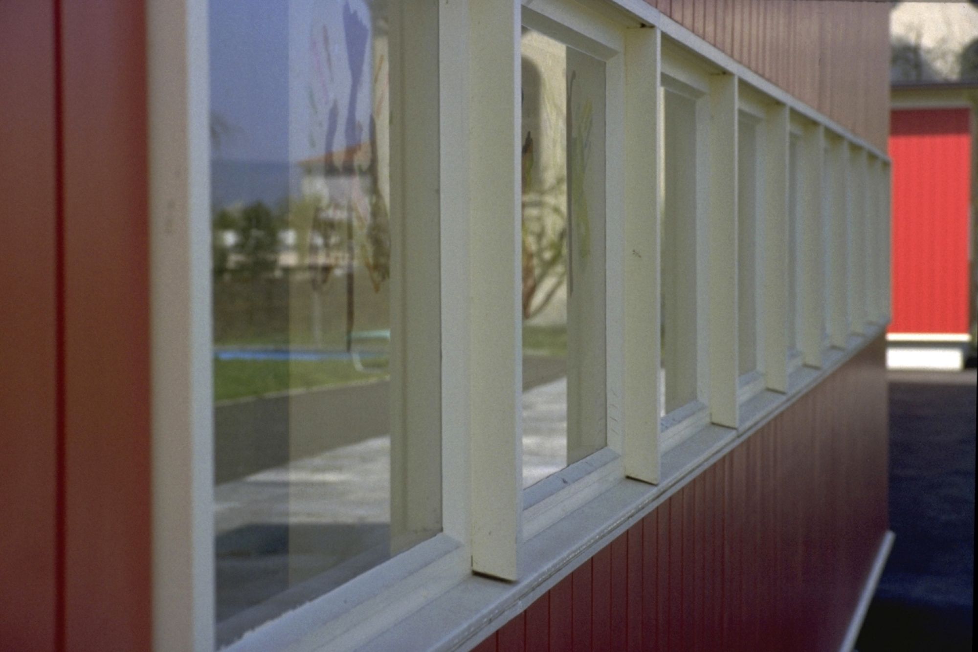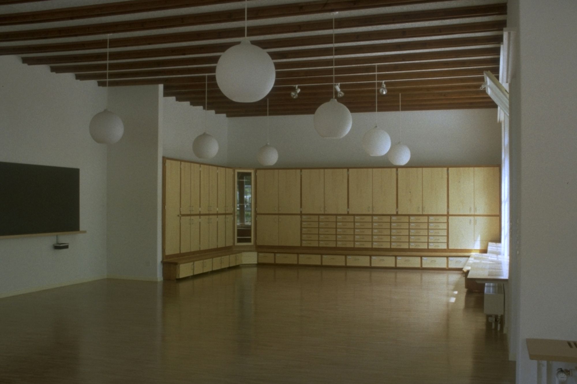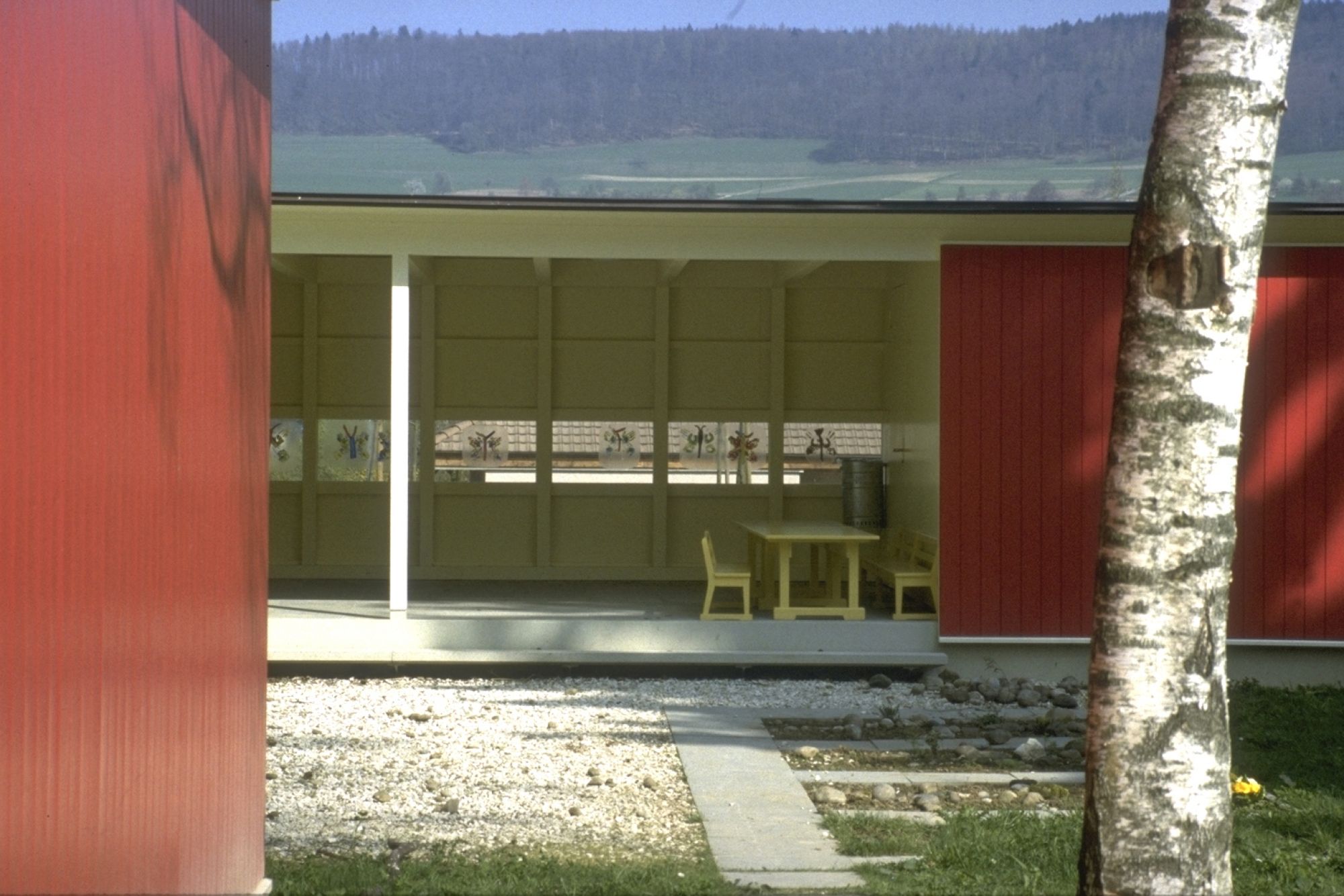 Der bestehende Mehrzweckbau im Kappelerhof aus den 40er Jahren mit einem Schulzimmer und anschliessendem Kindergarten wird zu einem vollwertigen Doppelkindergarten, indem dieser durch drei neue, windmühlenartig angeordnete Holzpavillons ergänzt wird.
